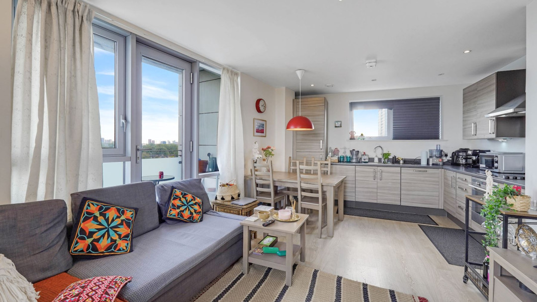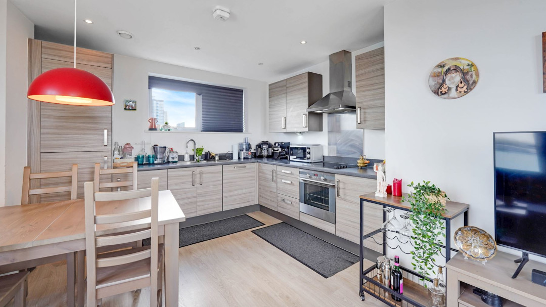 The ground floor features a bright and airy reception room with wood-effect tiled flooring and a large picture window to the front. To the rear is a stylish kitchen with sleek grey cabinetry, metro-tiled splashbacks, and space for both cooking and casual dining. A handy downstairs WC and direct garden access complete the layout.
