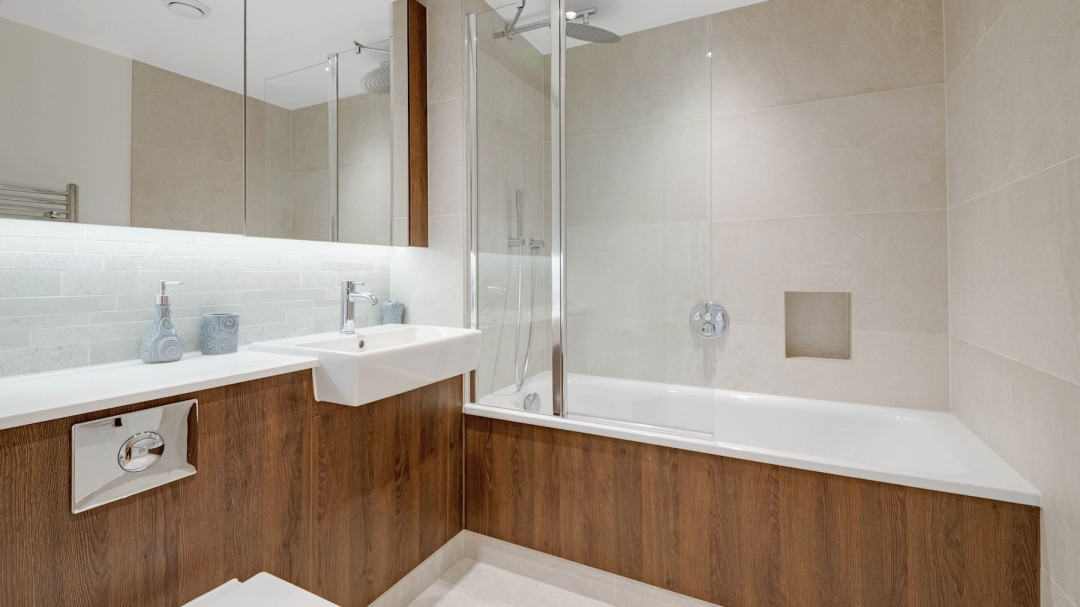 Both spacious bedrooms benefit from generous proportions and ample natural light; the principal bedroom includes built-in mirrored wardrobes and plush carpeting. The sophisticated bathroom is finished with contemporary porcelain tiling, a full-size bath with overhead rainfall shower, floating vanity, and premium fixtures.