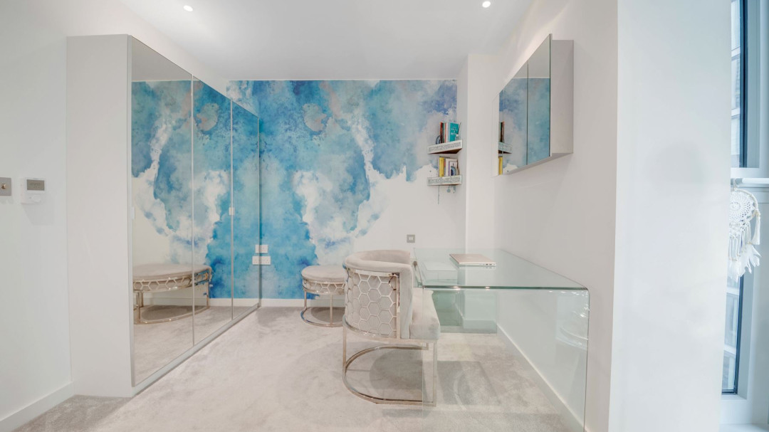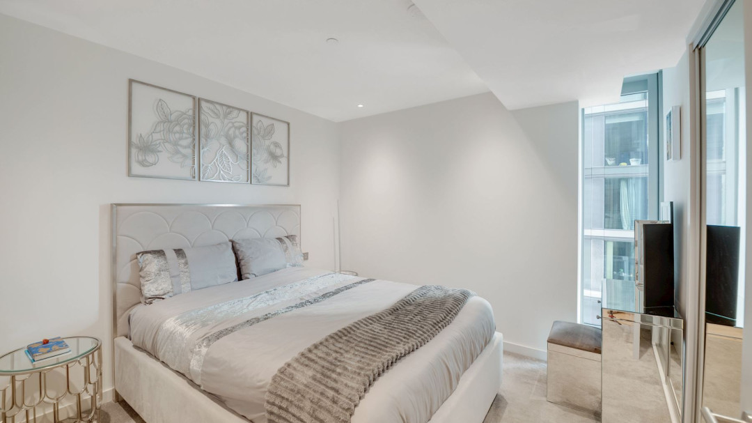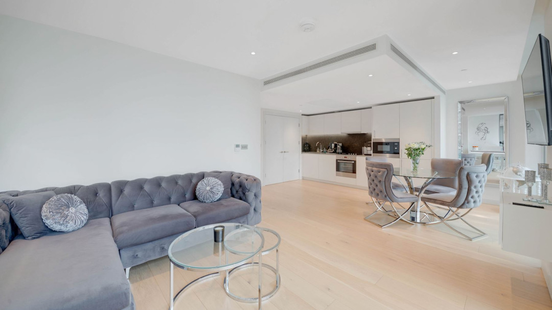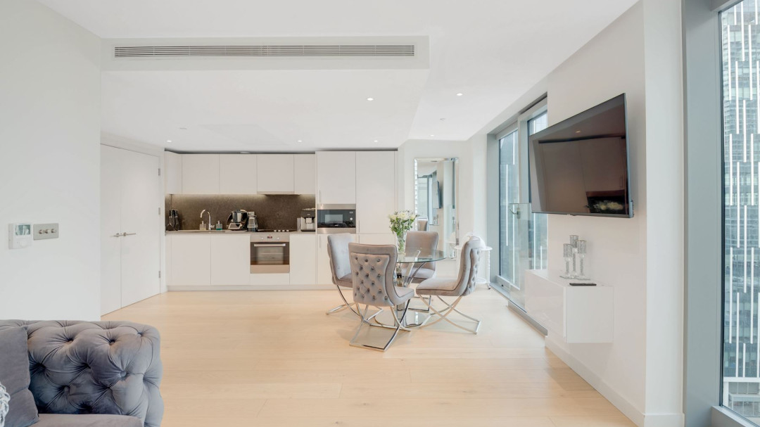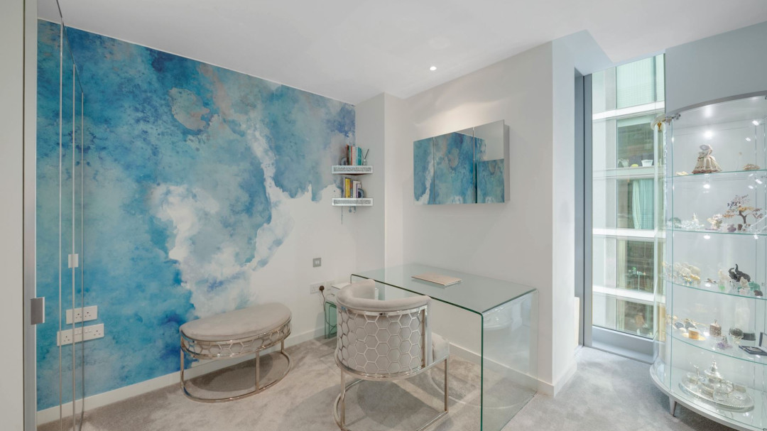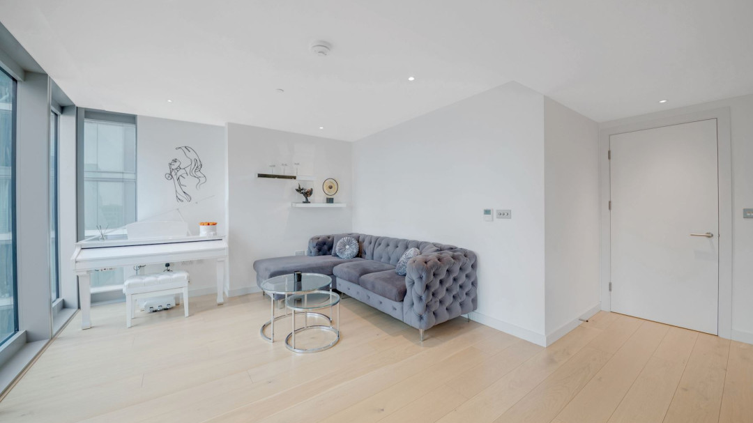 The expansive open-plan reception room is flooded with natural light through floor-to-ceiling south-facing windows, framing panoramic views over South Dock and the iconic Canary Wharf skyline. A private Juliet balcony extends the living space, creating a seamless connection to the city below. The modern kitchen features sleek matte white cabinetry and fully integrated appliances.