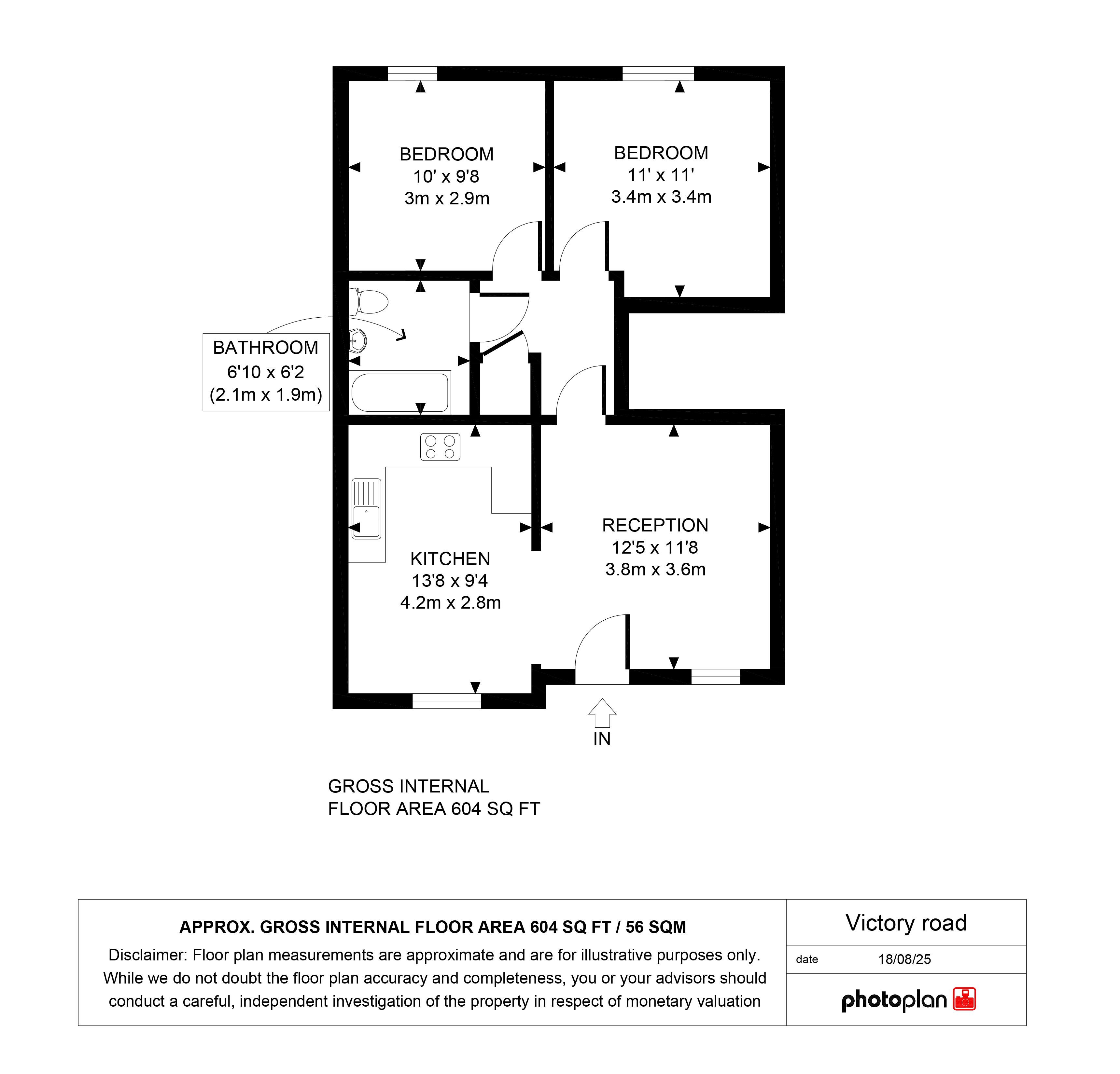 Both bedrooms are generous doubles with neutral décor and plenty of storage potential. The contemporary bathroom is sleek and well-finished, featuring a full-size bath with overhead shower, WC, and basin.