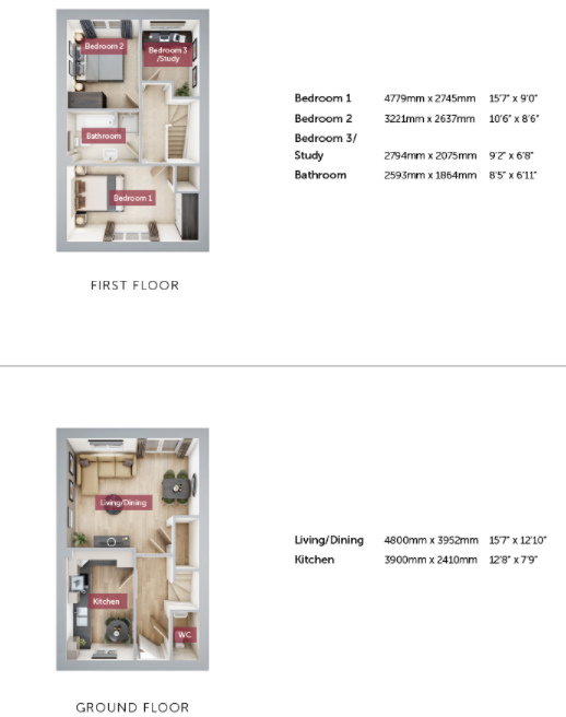 The Brampton is a beautifully designed home, featuring a light-filled living/dining room at the rear, with French doors opening to a south-east facing garden, creating a perfect space for entertaining and family gatherings. At the front, a modern kitchen offers a practical and stylish cooking area, while a downstairs WC and a convenient storage cupboard complete the ground floor. Upstairs, bedroom one stretches across the front and includes a second storage cupboard, while bedroom two provides a spacious double, and bedroom three serves as a flexible single, ideal for a study or playroom. This home also benefits from a single garage and two parking spaces.