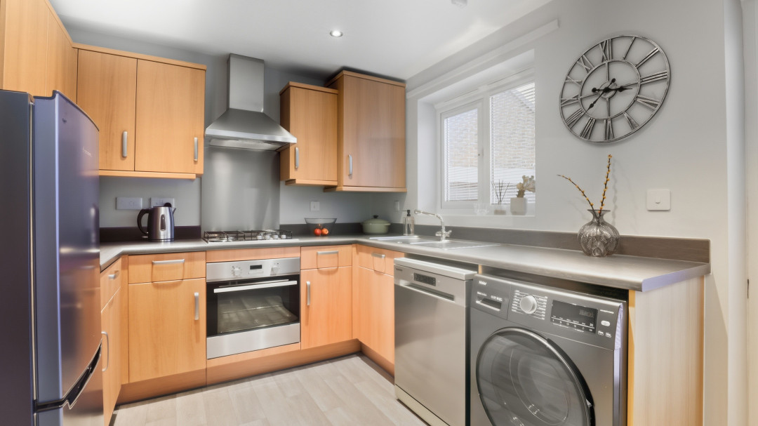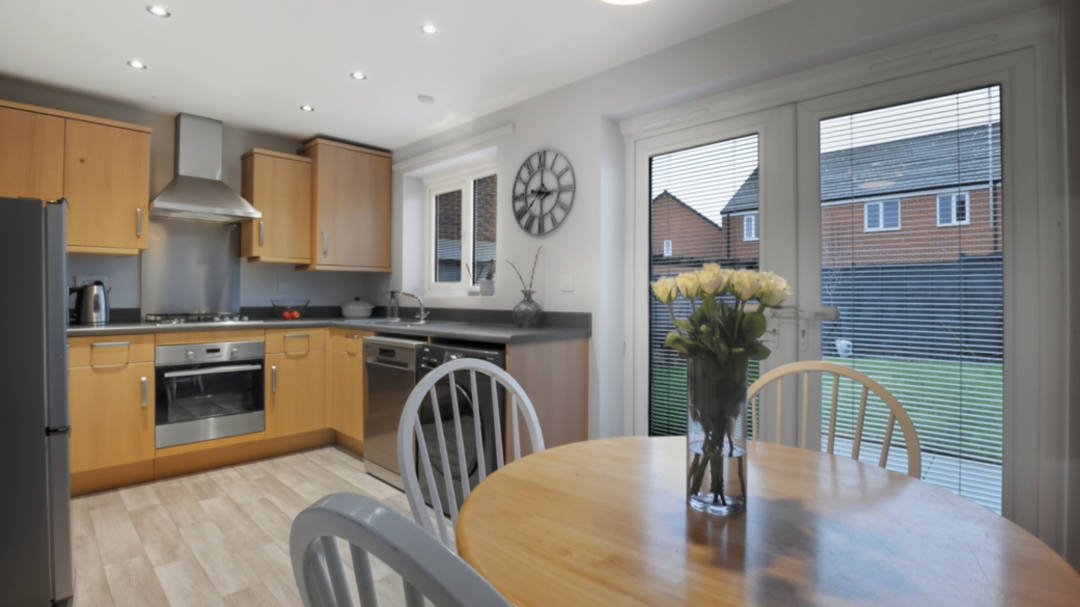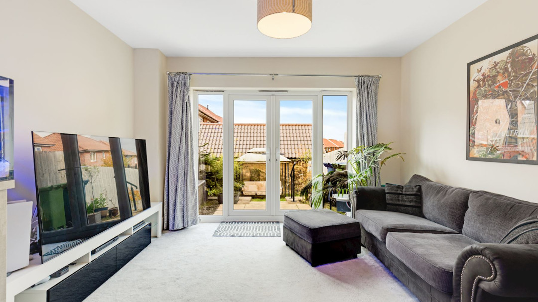 The spacious living room is a standout feature, boasting abundant natural light from large windows and French doors that open directly onto the garden, creating a seamless indoor-outdoor flow. Adjacent is the homely modern kitchen, complete with sleek wooden cabinetry, integrated appliances including oven, hob, fridge-freezer, dishwasher, and washing machine, plus plenty of room as a dining area.