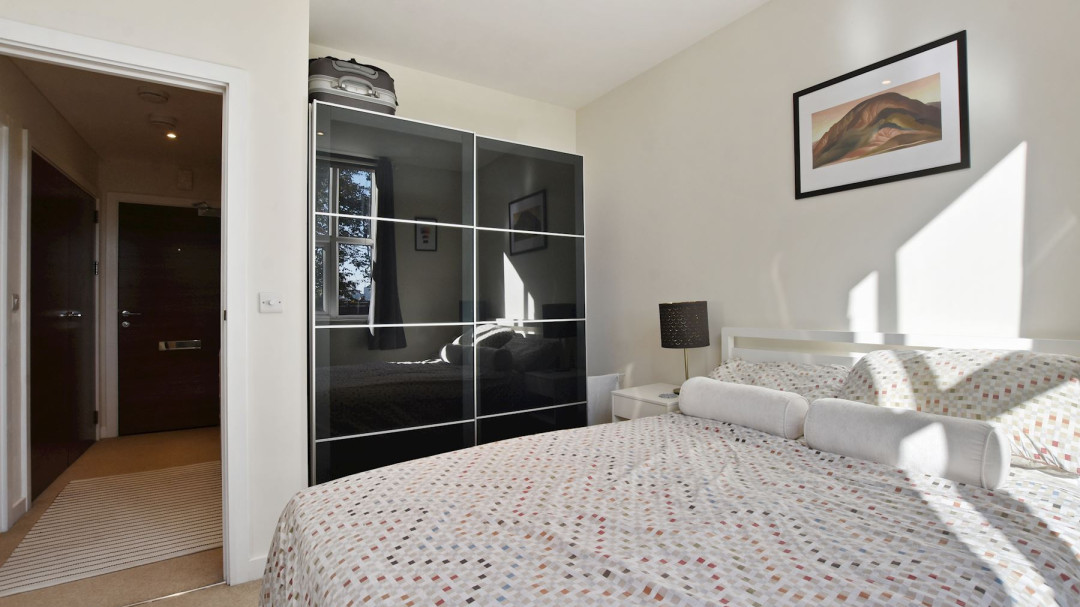 Both bedrooms are generously proportioned king-sized rooms with fitted double wardrobes, providing excellent storage. The modern bathroom features a full-size bath with overhead shower, while a spacious hallway cupboard offers further practicality, housing the washer/dryer and providing ample room for household storage.