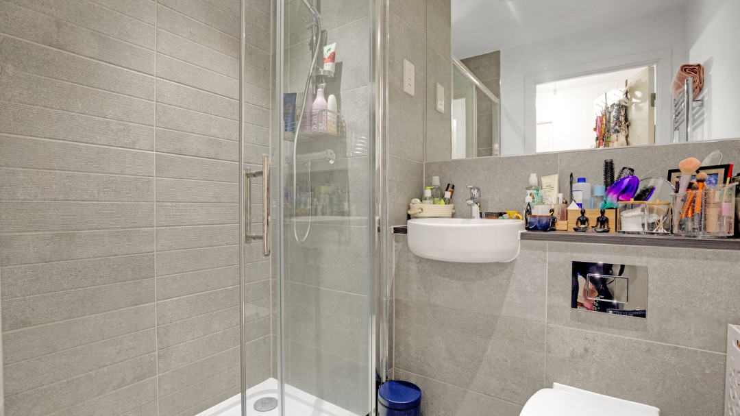 Both bedrooms are well proportioned and offer flexibility for home working or additional storage. The bathroom features modern fittings, a full-sized bath with overhead shower, and a large mirror with built-in shelf. Whilst the other bathroom consists of a sleek shower head and modern look, with convenient storage.