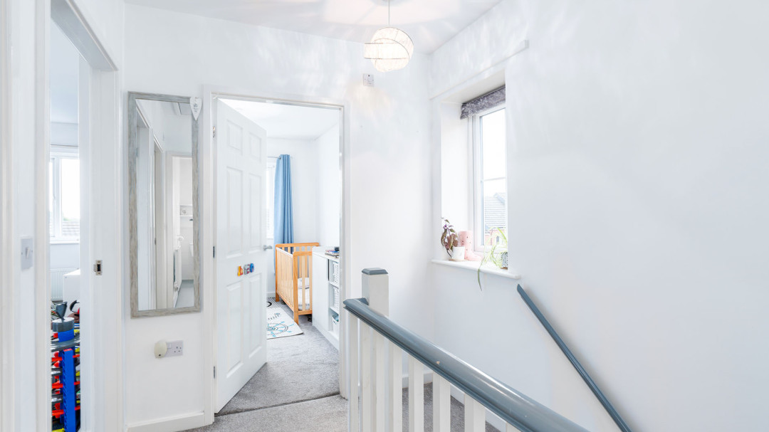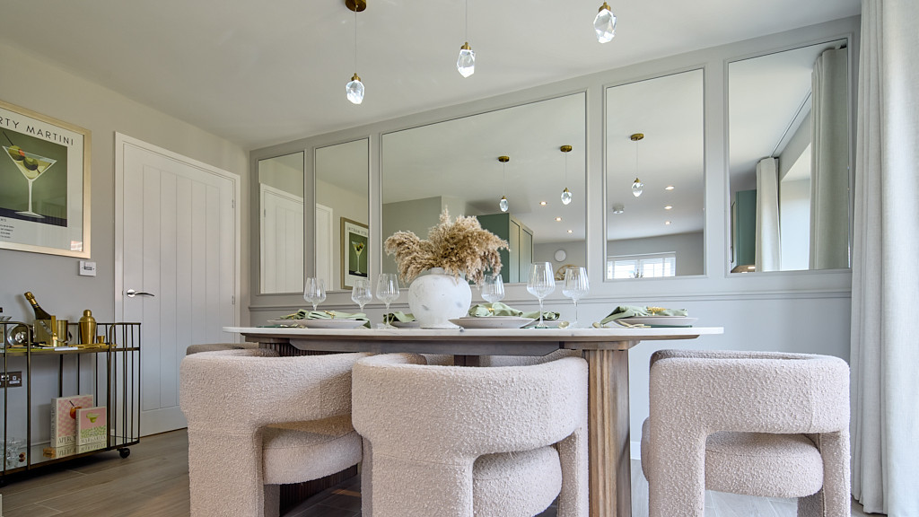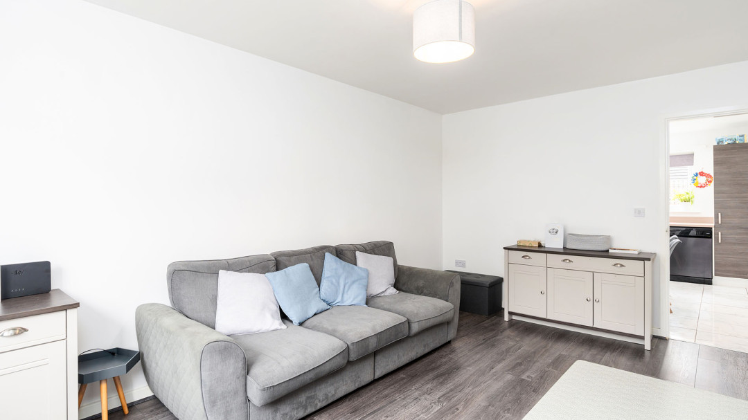 The ground floor opens into a welcoming foyer which leads into a bright and generously sized living room, with ample space for relaxation. At the rear of the home, a sleek kitchen features modern cabinetry, integrated oven, hob, and space for a family dining area - making it the heart of the home. A convenient downstairs WC, large under-stair storage cupboard and a separate laundry room with side door access to the garden complete the ground floor.
