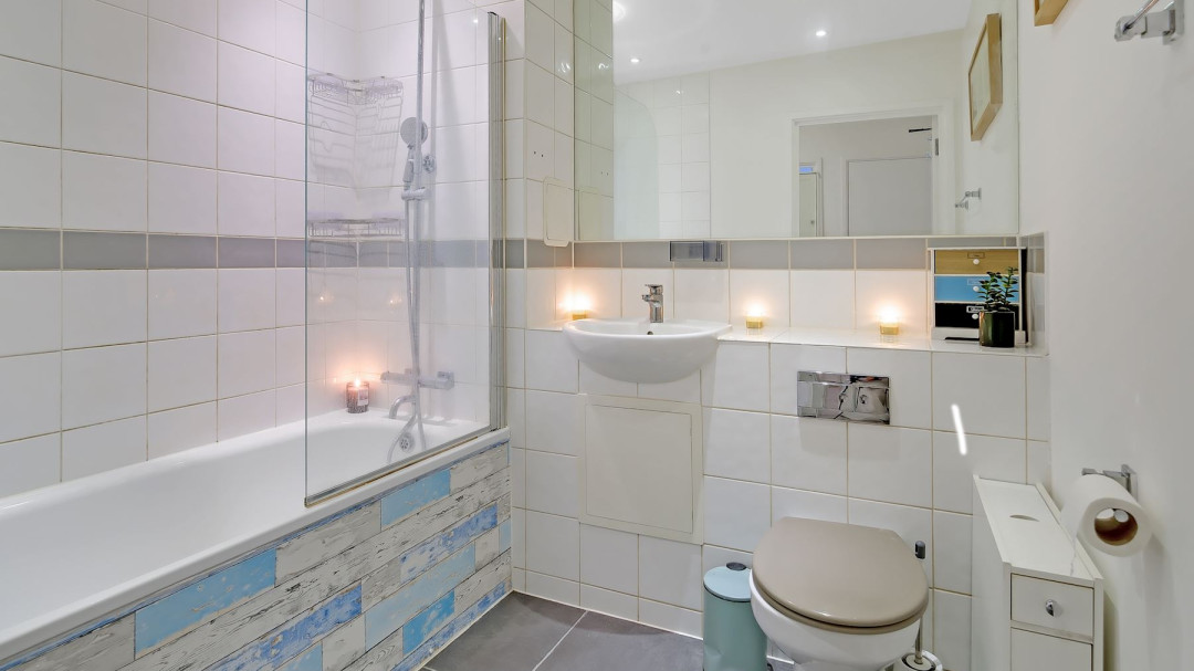 The homely, modern bathroom is finished to a high standard, complete with a bath with shower over, contemporary tiling, and a large mirror for a bright, spa-like feel.