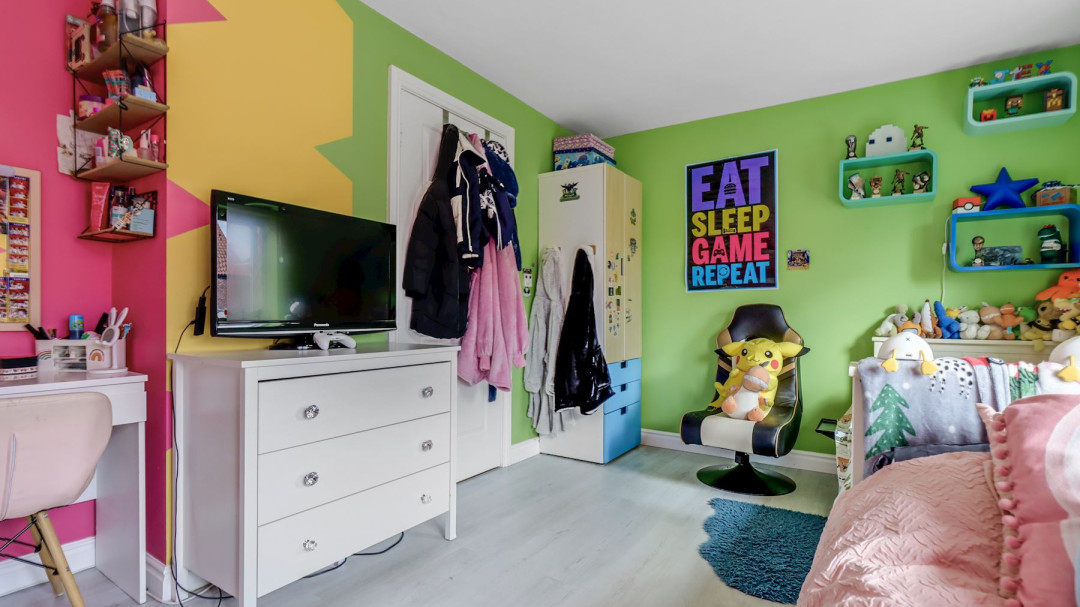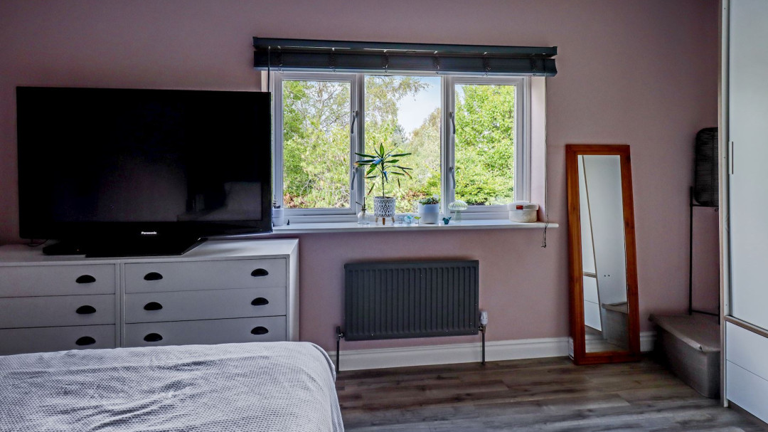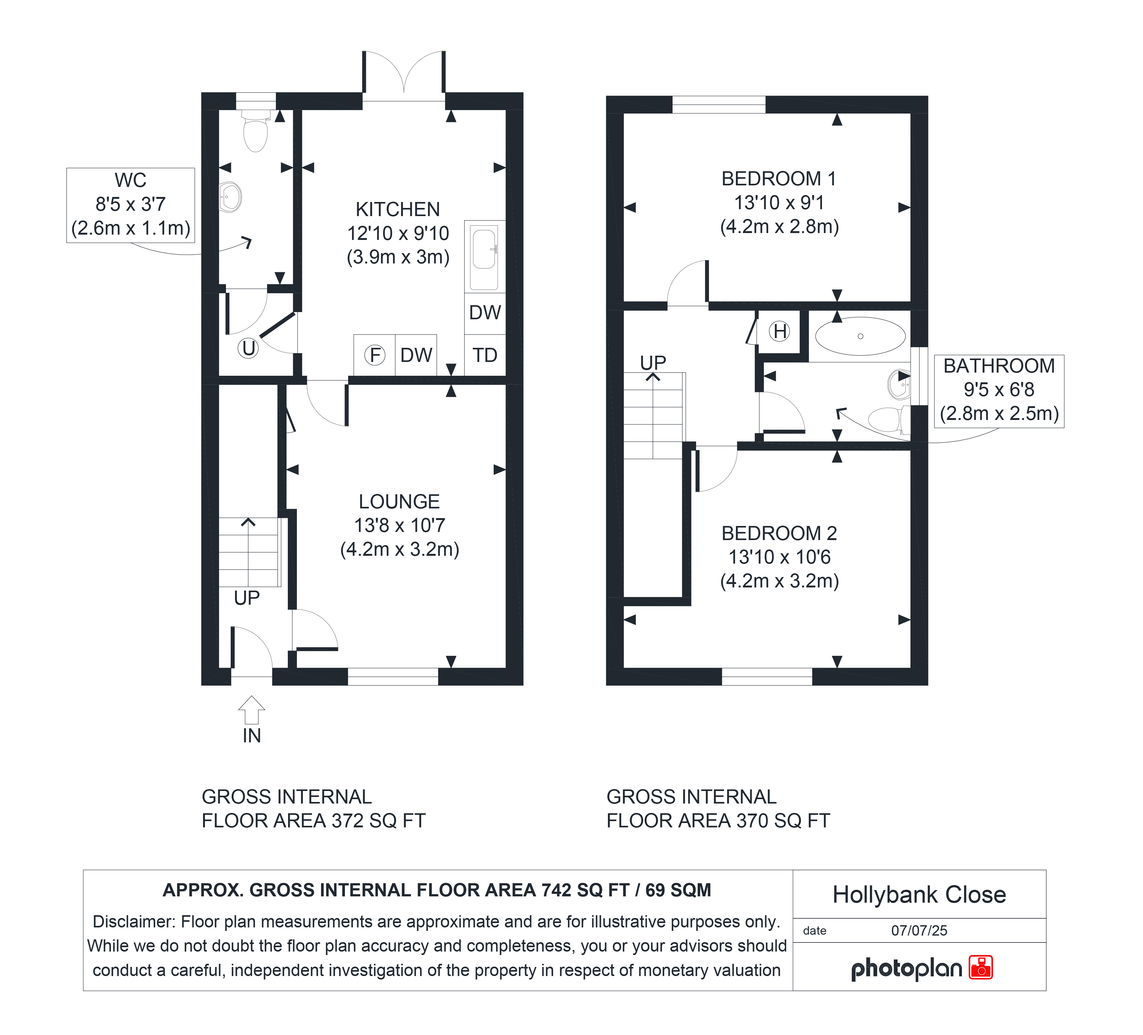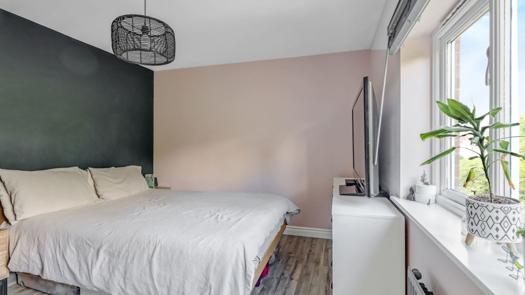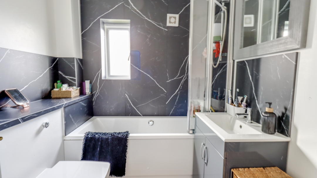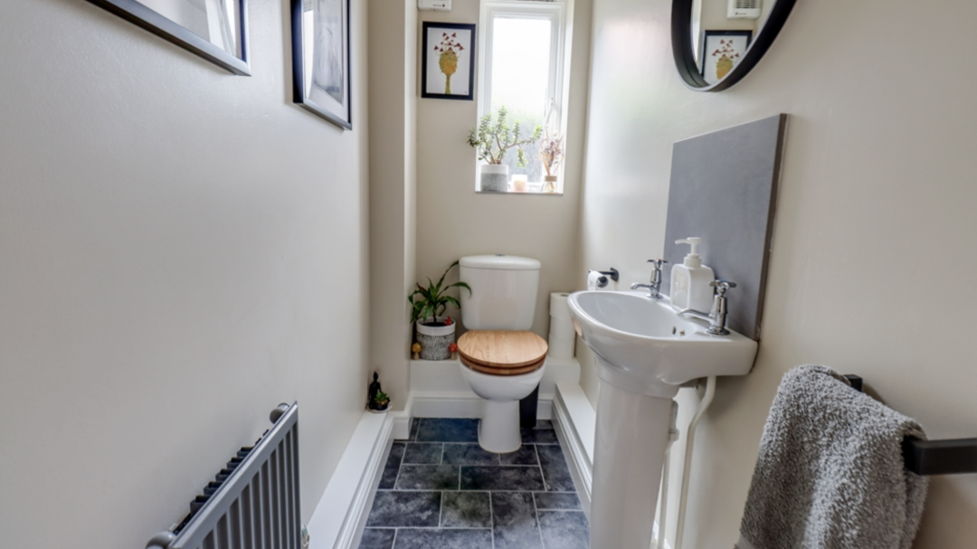 Upstairs, the home offers two large double bedrooms, each with ample space for wardrobes and furniture. The stylish family bathroom includes a bath with overhead shower, wash basin and WC.