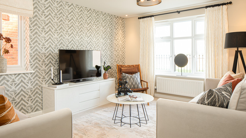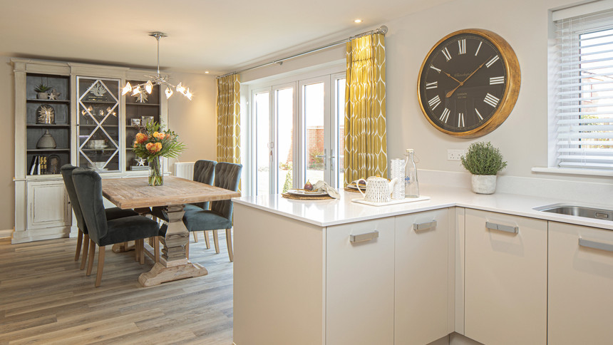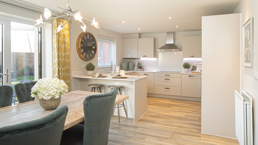A modern 3‑bedroom family home at Dracan Village, Burton upon Trent. Features include an open‑plan kitchen/dining area with skylight windows and French doors, a spacious living room with bay window, master ensuite, utility room, integral garage, and a landscaped garden.