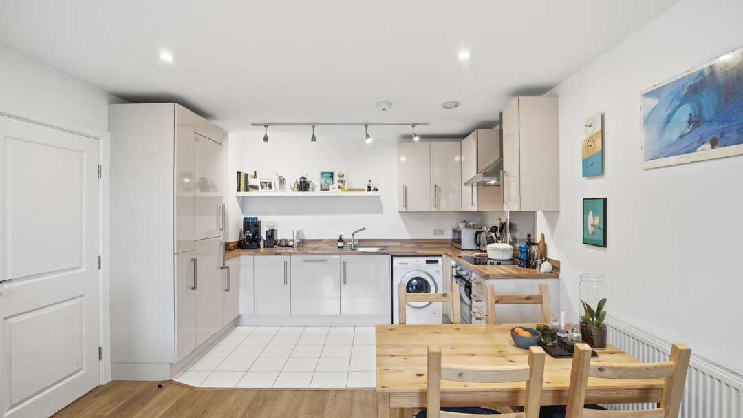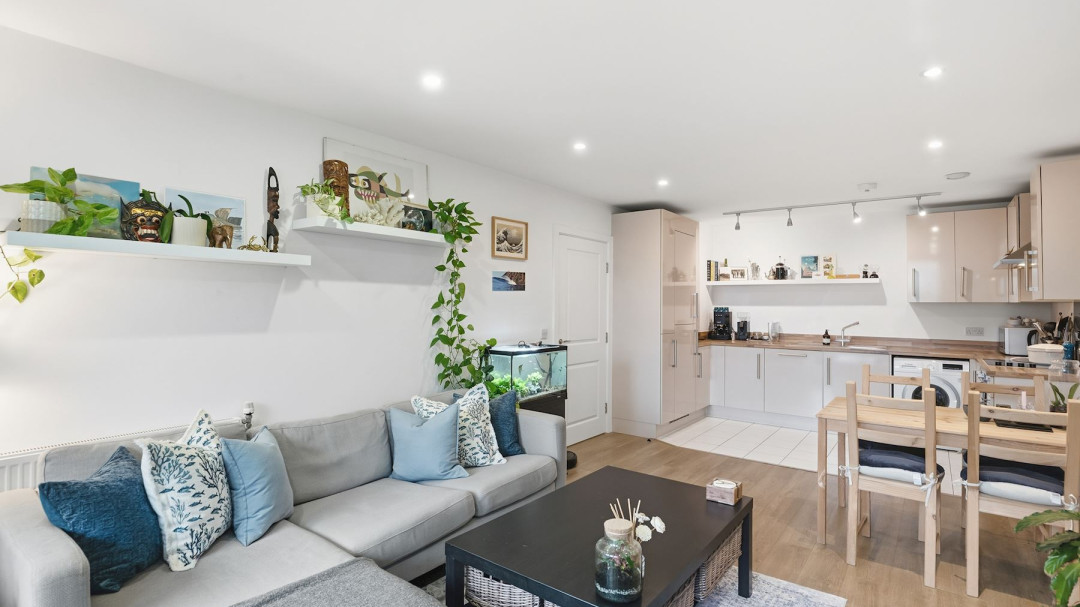 The open-plan reception room is spacious and airy, flooded with natural light and seamlessly flowing into the modern kitchen. The kitchen features sleek built-in appliances, plenty of storage, and a practical layout ideal for everyday cooking and dining.