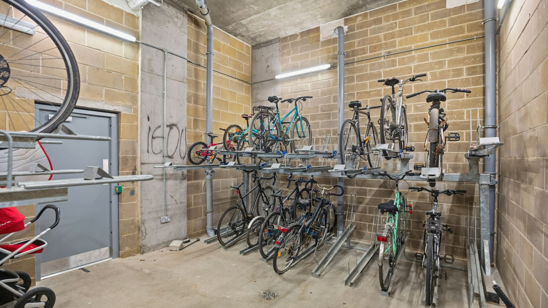 Convenience is key, with secure bike storage available within the building for residents.