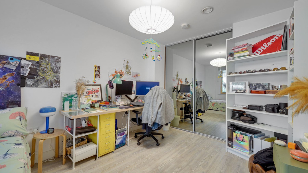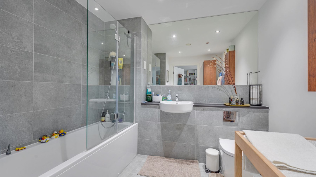 Both bedrooms are well proportioned and offer flexibility for home working or additional storage. The bathroom features modern fittings, a full-sized bath with overhead shower, and a large mirror with built-in shelf.